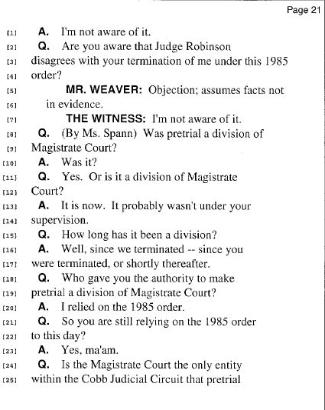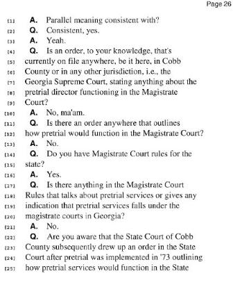 Cox admits under oath that he is unaware of any order in existence that outlines how Pretrial Services would function in the Magistrate Court. Page 26: lines 4-21