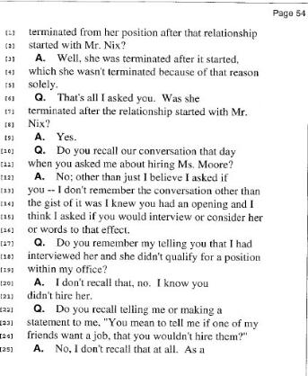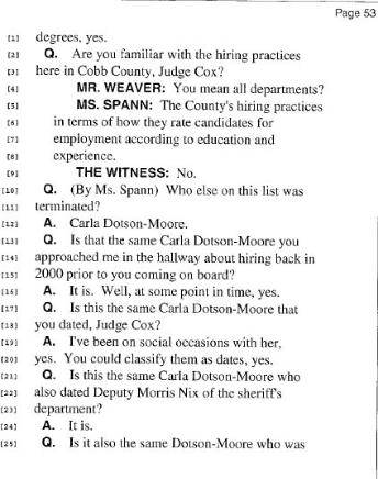 Also in the deposition, Spann questions Magistrate Cox about the termination of a female employee after she was no longer dating him. Page 53: lines 10-25 and Page 54: lines 1-9
