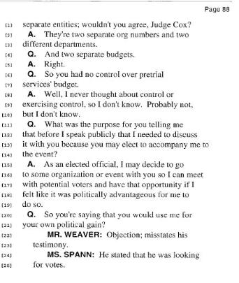 In the deposition Cox admitted that he wanted to attend events with Spann if he felt like it would be politically advantageous to him. Despite mistreating Spann on the job, Cox wanted to use her publicly to get votes. Page 88: Lines 11-25